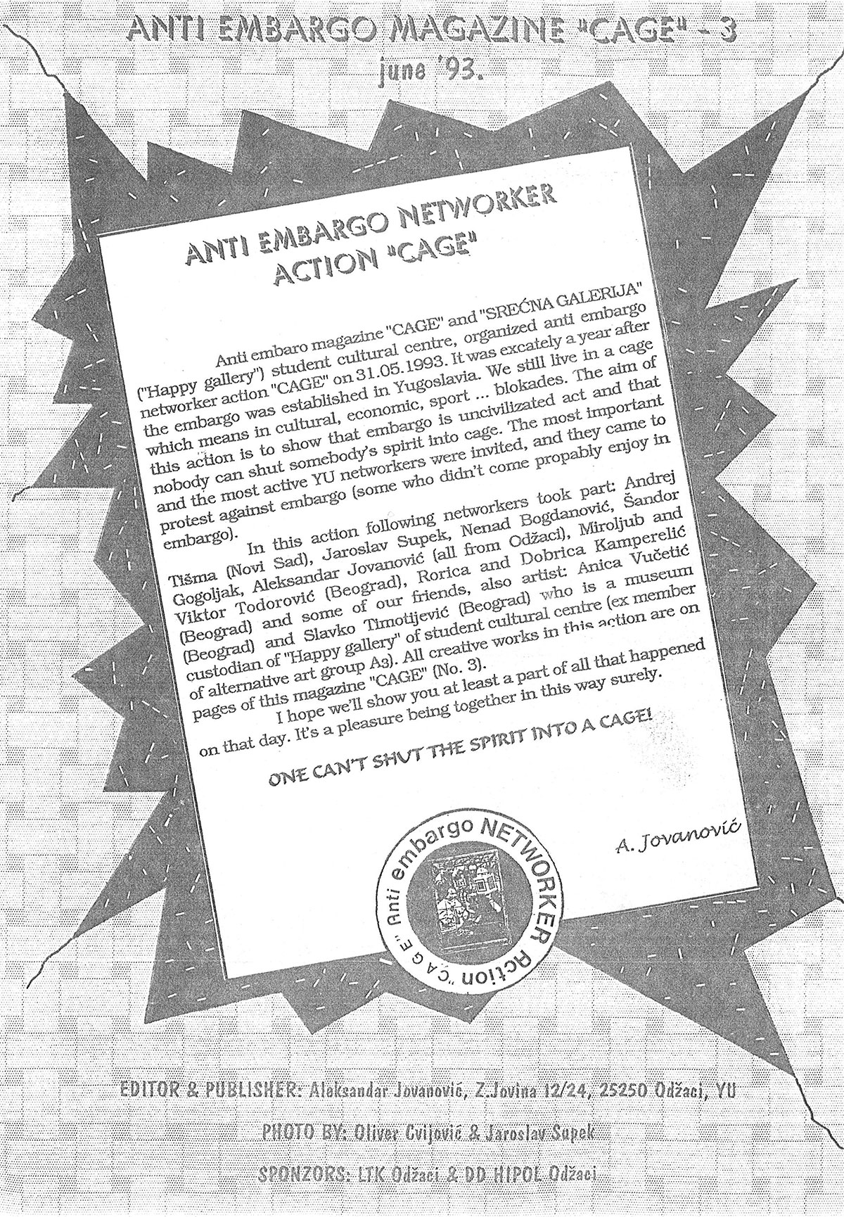 ”[...] apart from Jovanovic among the participants were : Jaroslav Supek, Nenad Bogdanovic, Miroljub Todorovic, Andrej Tisma, Dobrica Kamperelic, Sandor Gogoljak and Anica Vucetic, the artists making the nucleus of the "Cage" and its actions. In the series of actions in which the common accessories was a real Cage, the artists have shown their protest against the embargo in public. Documentation accompanying the actions was the content of the third issue of the magazine which was also presented to the whole world.” Tisma, Andrej: The Anti-Embargo „CAGE” Magazine, in: Krovovi magazine No. 36-38, November 1996, Sremski Karlovci, Yugoslavia