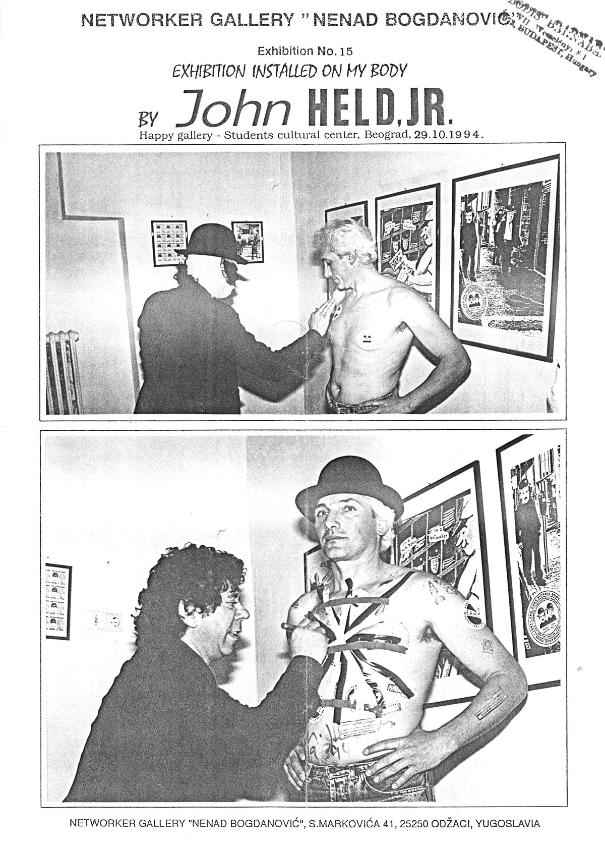(29 October, 1994, Happy Gallery - Student’s Cultural Center, Belgrade, Yugoslavia) installed on Bogdanovic’s body by John Held, Jr.