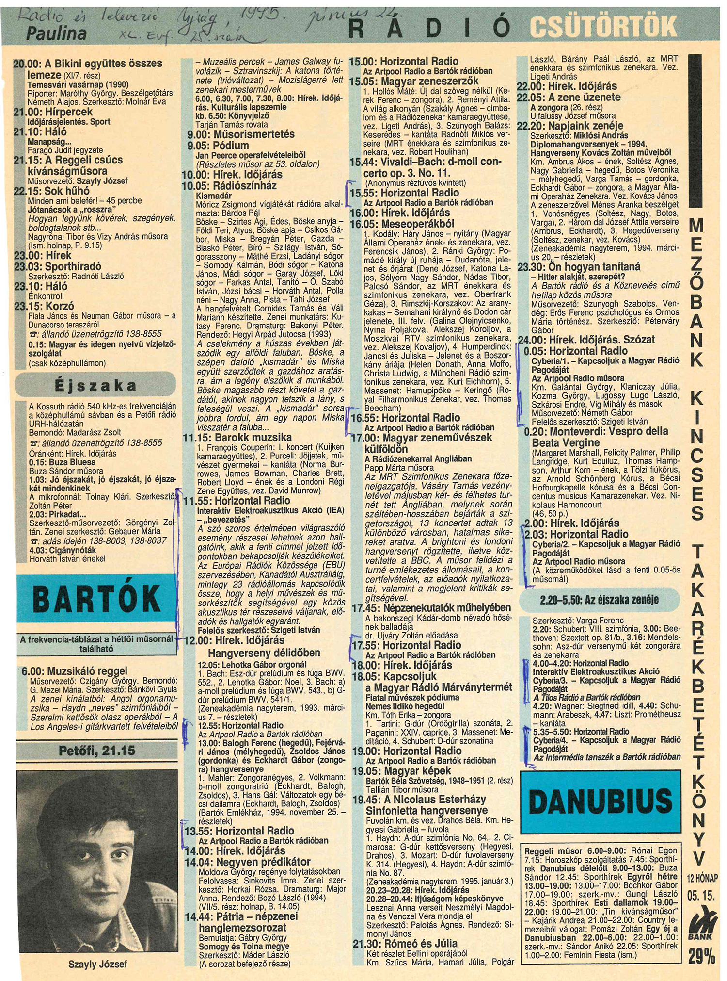 A Rádió és TV Újság korabeli száma a Bartók Rádió 1995. június 21-i műsorával