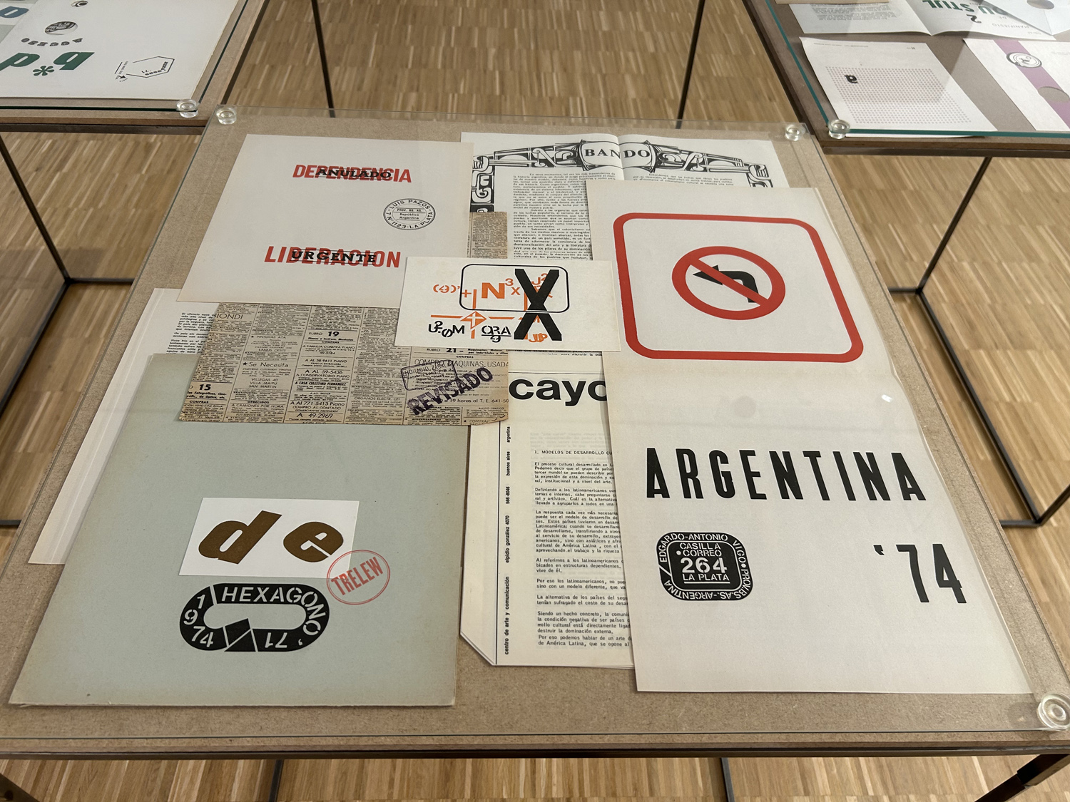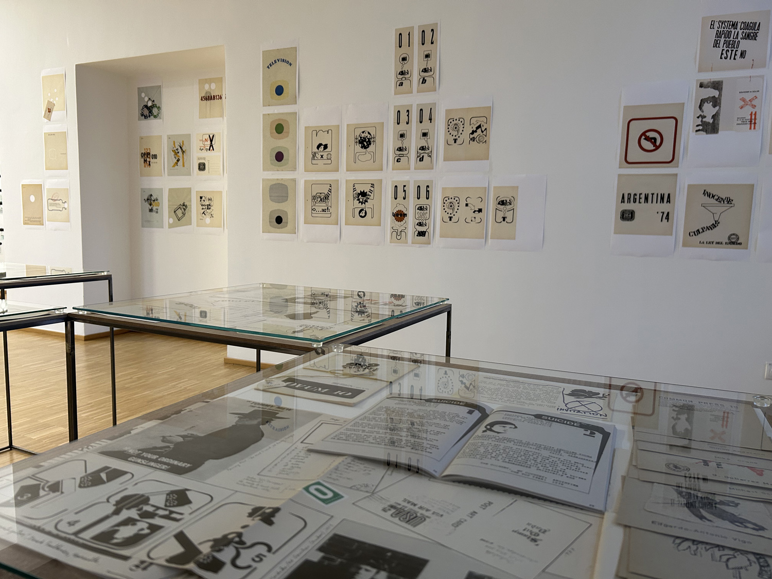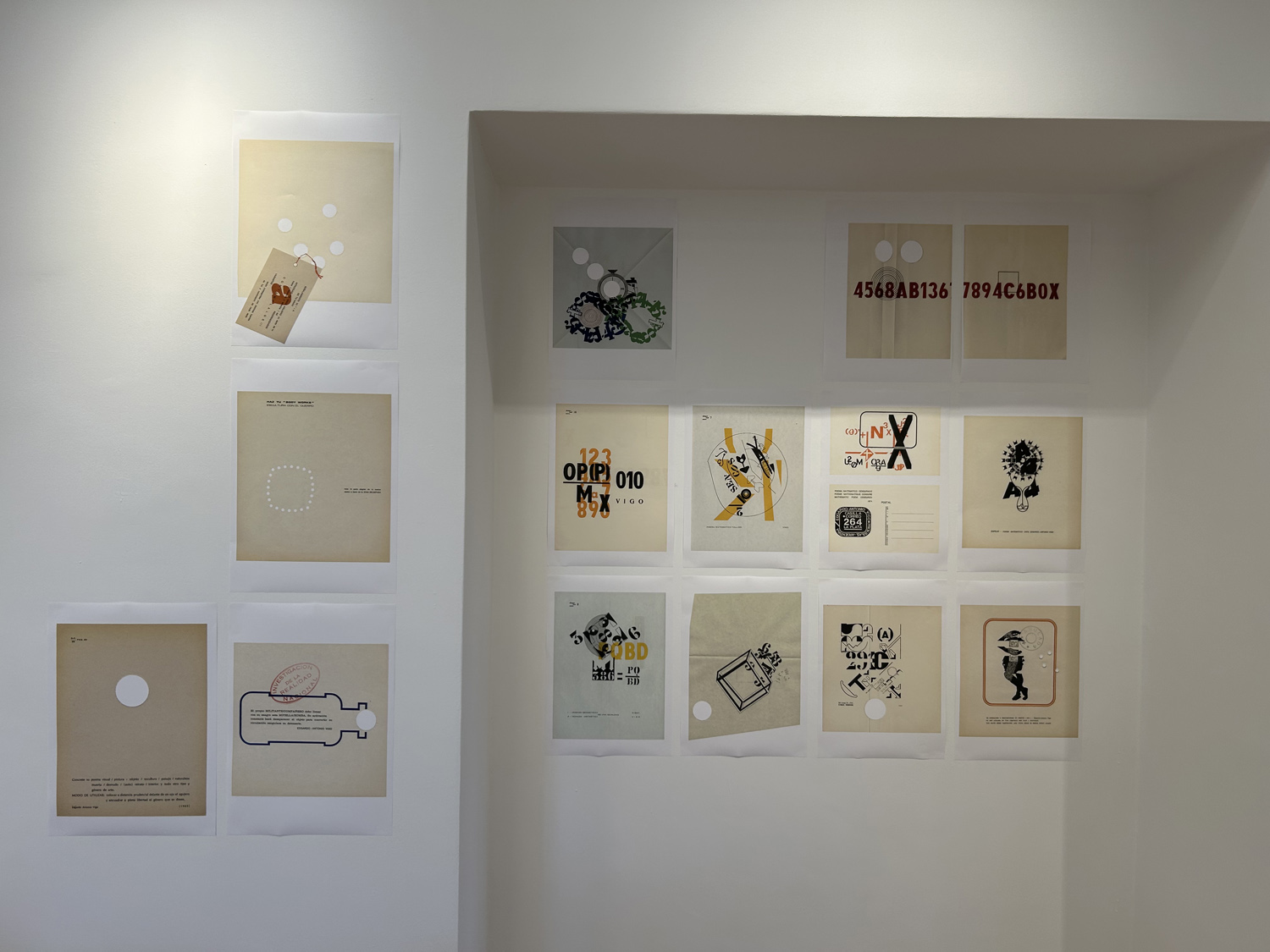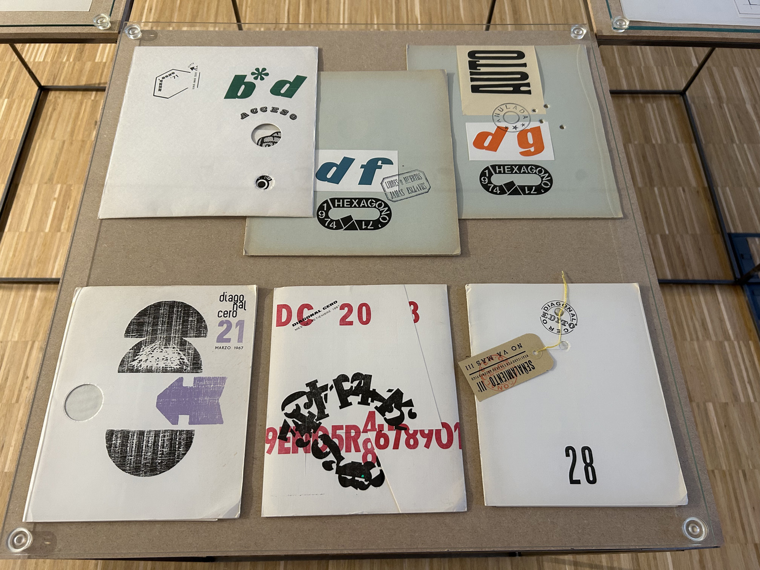Display from Artpool's collection of selected issues of the artists' magazines created by E. A. Vigo, including Diagonal Cero (1962–69) and Hexágono ’71 (1971–75), selected pages from the periodicals enlarged on the walls, a selection of postcards sent by Vigo to György Galántai / Artpool, László Beke and Peter Küstermann of Germany in the 1980s, as well as his works published in the publications of other mail artists.
