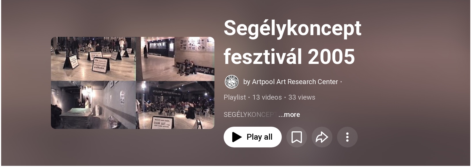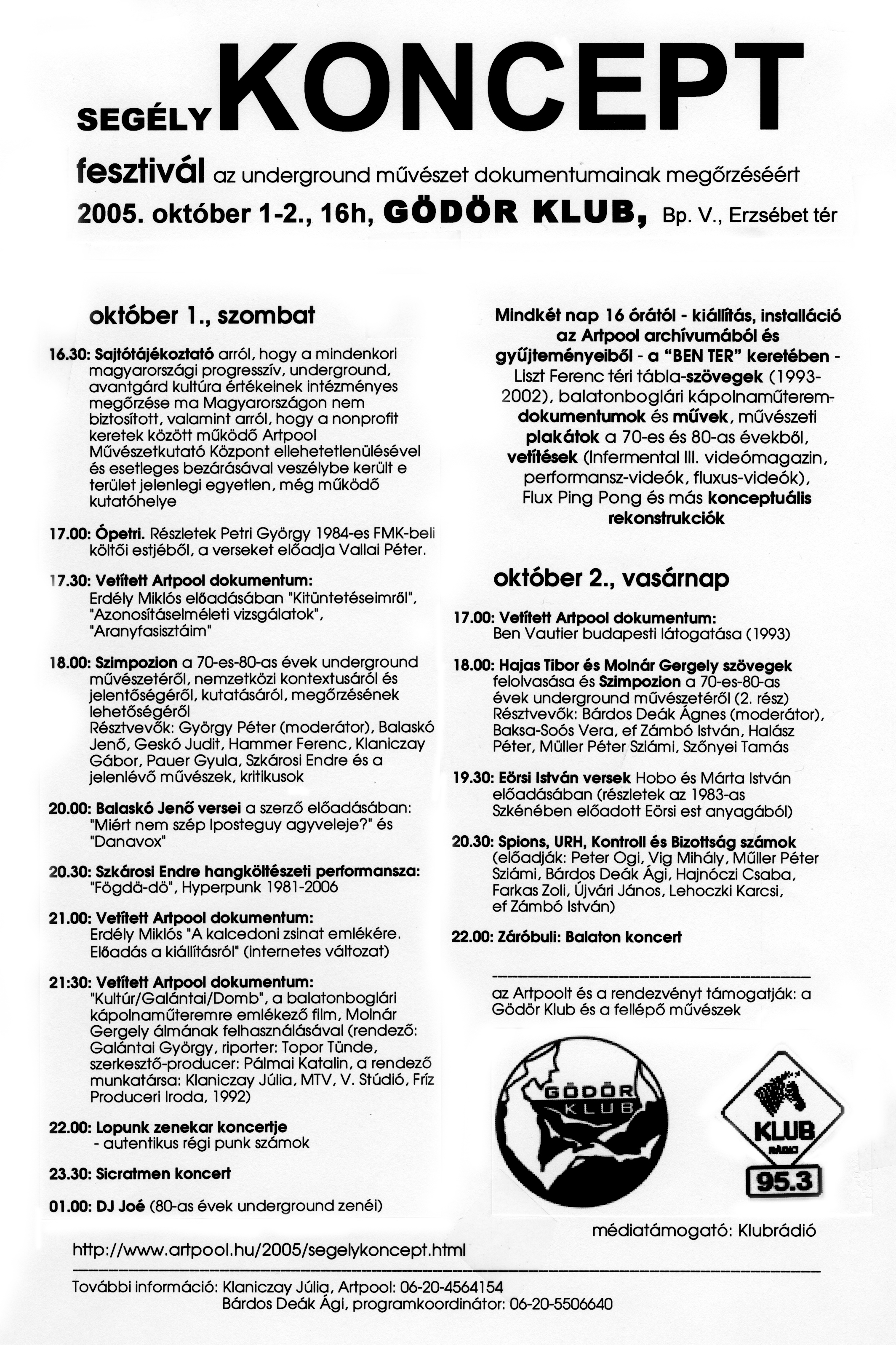 Az egyre reménytelenebb helyzetben a szélesebb nyilvánosság megszólítására – az Artpoolba egy szeptemberi napon véletlenül betoppanó – Bárdos Deák Ágnes ösztökélésére vállalkoztunk, aki felajánlotta a segítségét egy, a Gödör klubban rendezendő támogató eseménysorozat megszervezéséhez. Ez lett a kétnapos SEGÉLYKONCEPT fesztivál