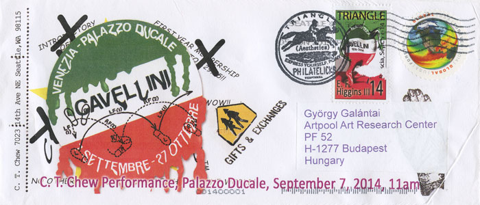 Vittore Baroni smile action stamp and centennial stamp project C. T. Chew stamp sheet, posters and envelopes [1] [2] [3] C. T. Chew Performance Palazzo Ducale, September 7, 2014, 11am (video) Walking in Brescia town (Carl Chew and Gianni Romeo again) Cavellini Police in Brescia take U.S. male into custody for being "fake Cavellini artist". C. T. Chew stamp sheet, posters and envelopes [1] [2] [3] Vittore Baroni smile action stamp and centennial stamp project
