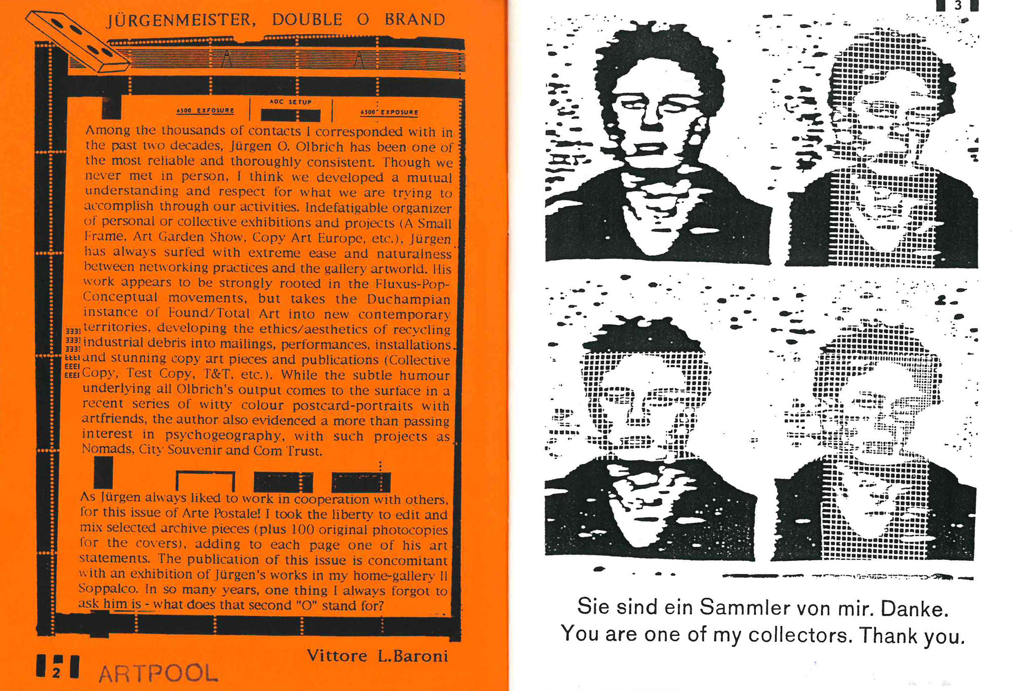 Issue dedicated to Jürgen O. Olbrich, Baroni’s assiduous correspondent, to whom he decided to dedicate an exhibition at Il Soppalco and a monographic issue of AP! The magazine's few pages feature a series of Olbrich's works (photo collages, images, stamps, phrases) stored in Baroni's archive, to which the editor adds statements by the artist in English and German.