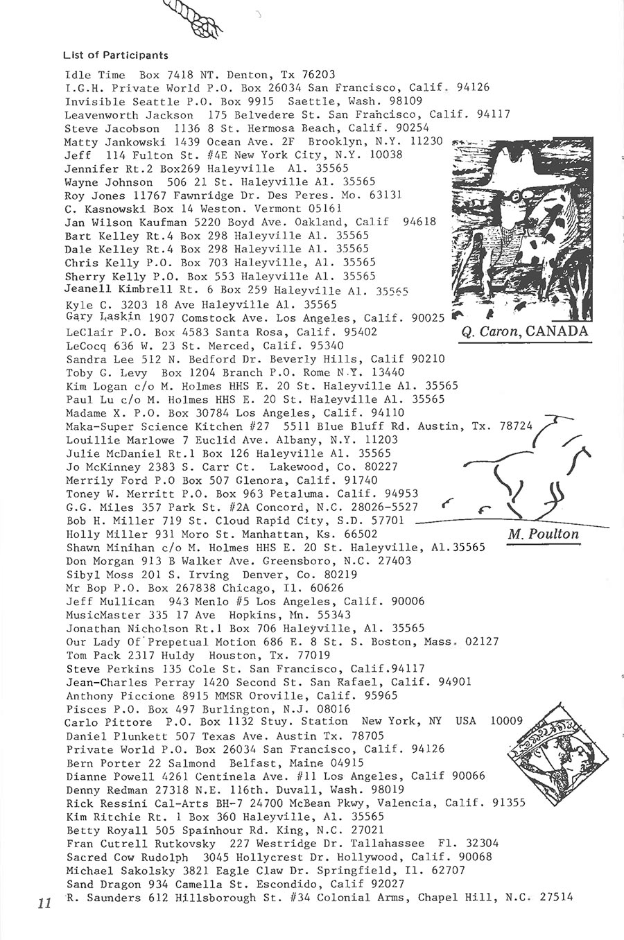 List of participants, photos of the exhibition and works by Mark Dicey, Carlo Pittore, Jacques Massa, Nelson L. Hendricks, Ruggero Maggi, A. De Araujo, The Duplex Planet, Ben Burgraff, Anna Banana, Monty Cantsin, Aaron Flores, John Sherlock Hersey, Q. Caron, M. Poulton, Cavellini, Shozo Shimamoto