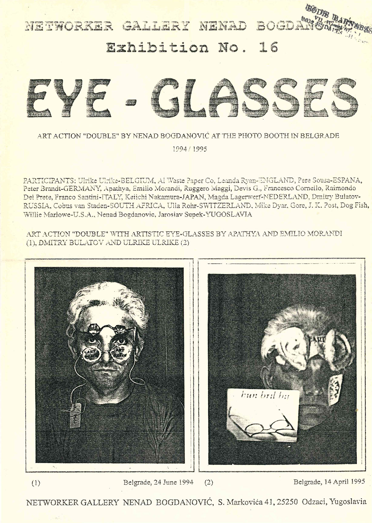 (1994/1995, Belgrade, Yugoslavia) was a double performance at a Belgrade photo booth wearing artistic eye-glasses by participants
