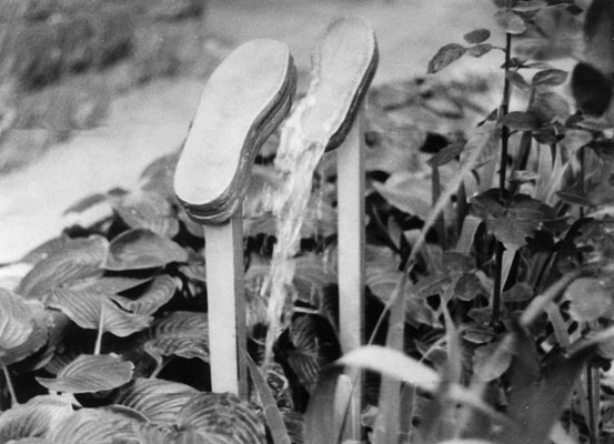 Lépésfolytonosság, 1983A szobor első kontextusa: a vidám nyári vegetációban a kisnyomású kerti csapvíz által imitált „jövő”, más nézőpontból a múlt nélküli jelen.